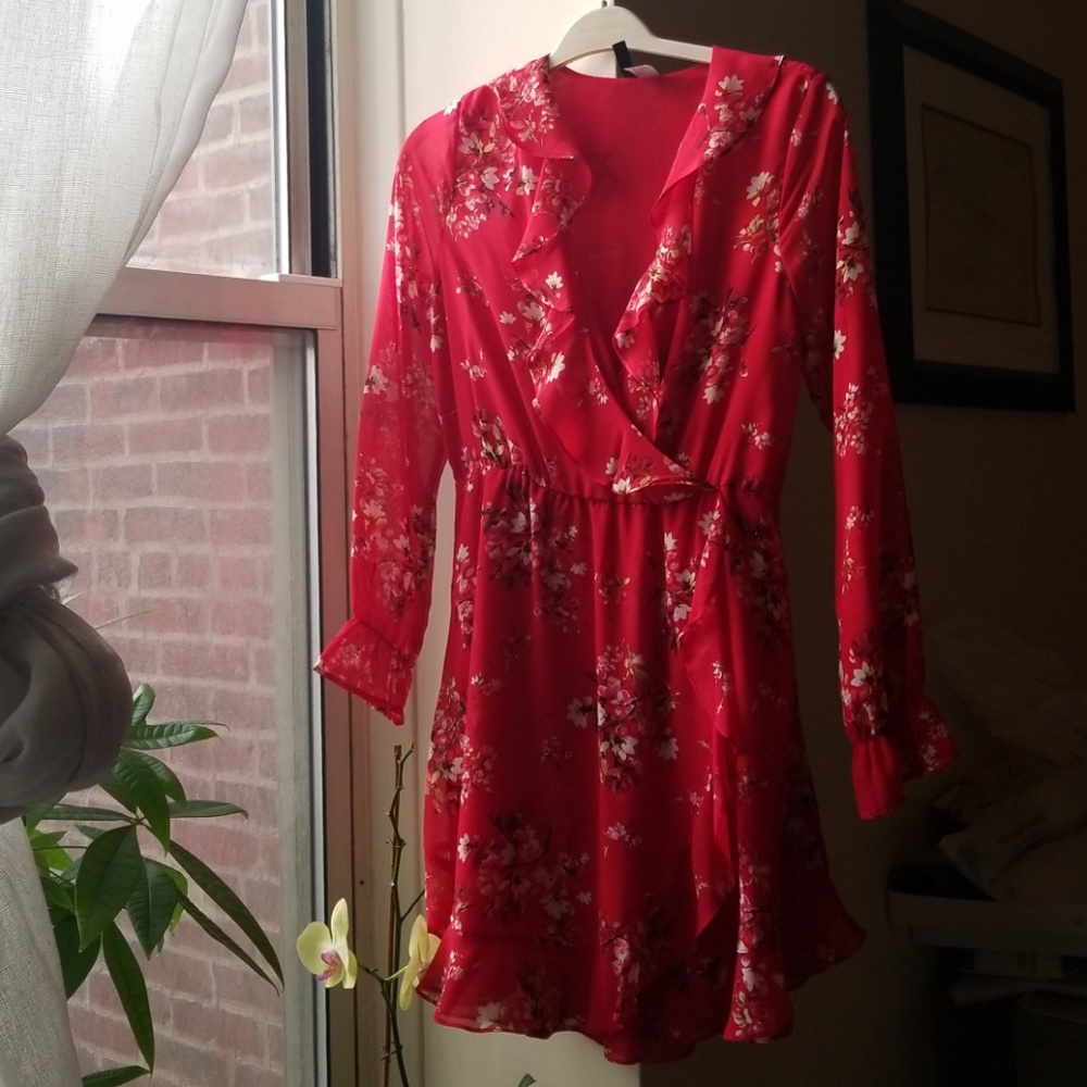 Ruby red ruffle mini-dress with delicate floral details. Faux wrap front makes for a flattering fit!