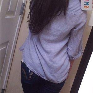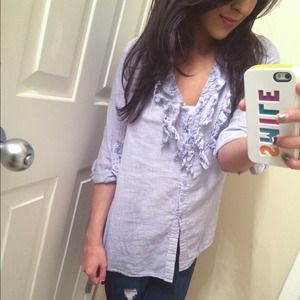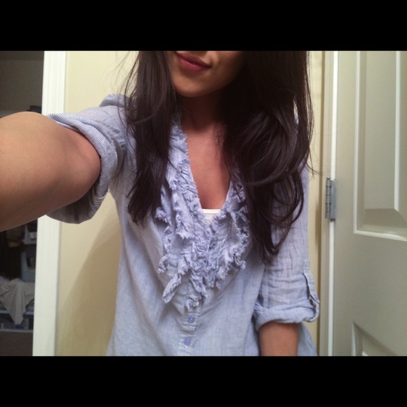 100% cotton. Baby blue color. It has ruffles around the neck line. This blouse looks beautiful with jeans or shorts! You'll love it!