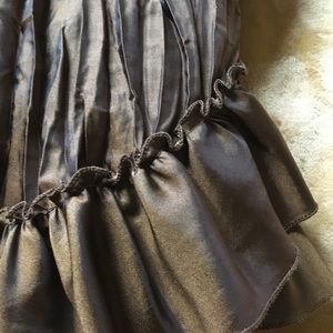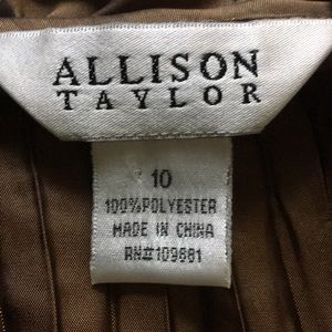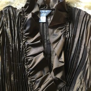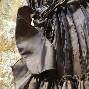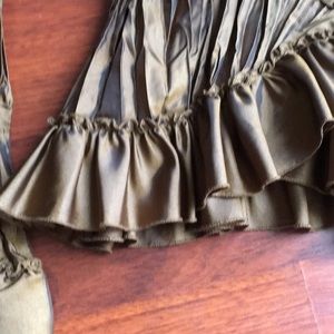 Gorgeous, slightly iridescent bronze-tone fabric and romantic styling in this Allison Taylor long sleeve wrap top. Side tie, Ruffles and long bell sleeves. Size 10. Smoke Free Home