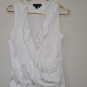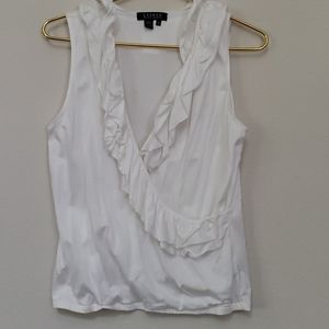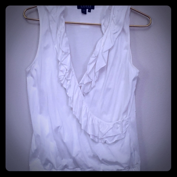 Ralph Lauren Romantic Ruffles White Stretch Knit Faux Wrap Crossover Blouse looks great over a long flowy beack dress or maxi skirt.