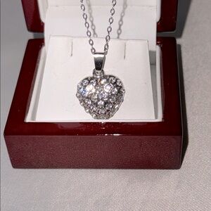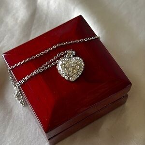 Brand new. Add a touch of sparkle to your look with this beautiful vintage-inspired heart pendant necklace. Featuring a silver-tone chain and a dazzling heart charm encrusted with clear pavé rhinestones, this piece is perfect for both casual and dressy outfits. A timeless accessory that makes a great gift or a sweet addition to your own jewelry collection.
