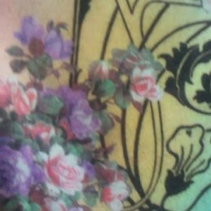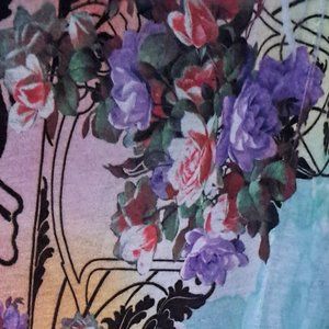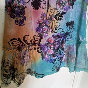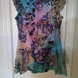 Turquoise/Pink/Purple. Size Large. Sleeveless. Silky Feel. Unique. Romantic. Flowers. Floral. Ruffled. Flows nicely. Falls well below the waist. Very pretty top!