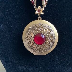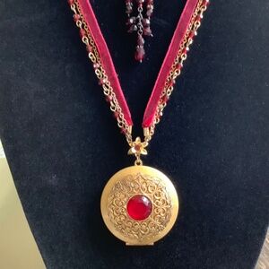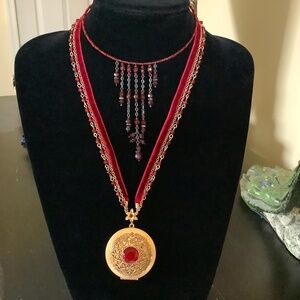 Boho Locket necklace with three rows, one chain, one red beaded chain, one red velvet ribbon.