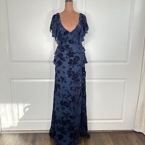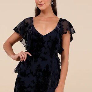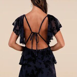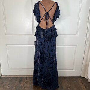 Romantic Wonder Navy Burnout Velvet Ruffled Tie-Back Maxi Dress Medium - NEW