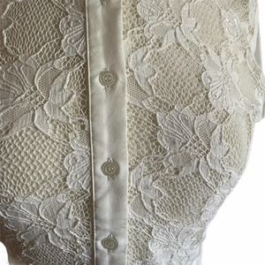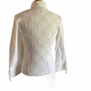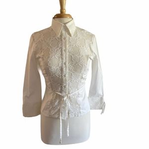 Entracte Paris romantic off white collared lace fitted blouse with thin matching belt.