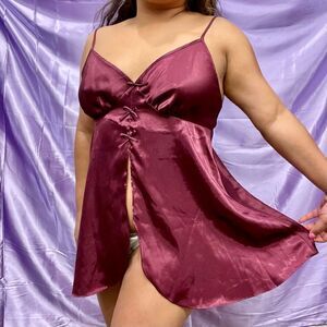 Romantic Burgundy Nightgown ~ size medium ~ brand is Cinema Etoile ~ excellent condition ~ beautiful rich color ~ smooth to the touch ~ split front ~ three bows on bust ~ plunge v neckline ~ adjustable straps ~ flirty & fun