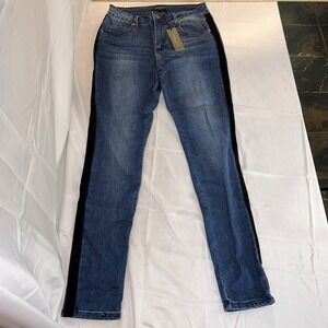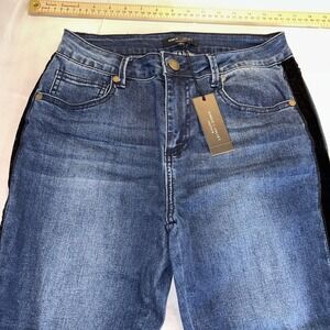 The Romeo And Juliet Couture Women's Striped Denim Pants Jeans in Medium are a stylish and versatile addition to any wardrobe. These crop Capri jeans feature a side striped fabric grommet insert accent, a mid-rise fit, and a 5-pocket design with a 25-inch inseam. Made from a comfortable cotton blend denim, these jeans are suitable for all seasons and can be machine washed for easy care. Perfect for a variety of fashion styles, from classy to bohemian, these jeans combine classic denim with a unique striped pattern for a fashionable and trendy look.