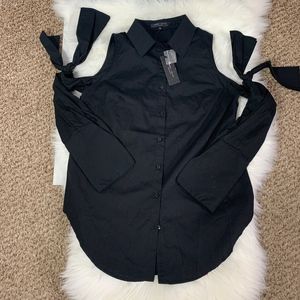 Features: Spread collar - Button front closure - Long sleeves with tied cold shoulder cutouts and wide, open cuffs with single button closure