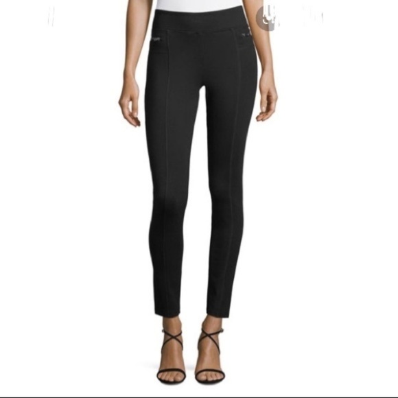 NWT Thick yet soft and giving legging pants. Functioning silver toned zippers at hips open and close as an accent to faux pockets. Stitching detail down front and back of legs.