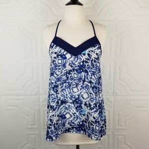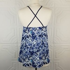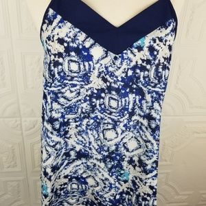 Navy blue, white, grey and turquoise splash splatter print, spaghetti cross strap top.