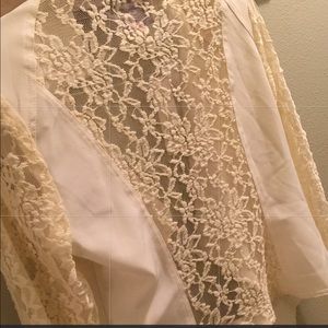 Romeo & Juliet Couture Cream Lace Moto Jacket. Back & sleeves are solid lace front is poly/nylon/spandex with copper colored zippers. Very hip, edgy & feminine. Perfect as a layer over a strapless or strappy dress... Prom, cocktail party?