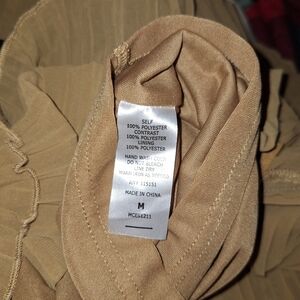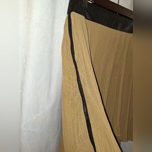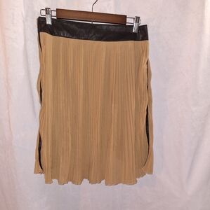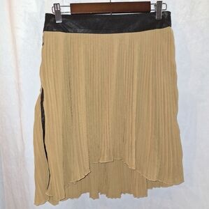 This tan midi skirt by Romeo & Juliet Couture features a chic A-line silhouette with fine pleats and a stylish high-low hemline. Perfect for casual or work settings, its lightweight fabric offers a soft, flowing appearance that enhances its elegant design. side to side measurements is 14.5" top of waist to bottom hem is 17.5" bundle more items for bigger deals Bin-148