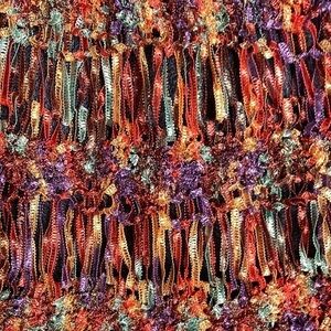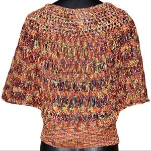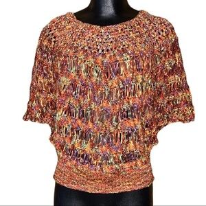 Open weave ribbon yarn crochet sweater crop top from Romeo & Juliet Couture. Multi color yarn in shades of orange, green and purple. Elbow length batwing sleeves connect to banded waist. Scoop neckline. 100% Rayon. Very good condition, no snags or flaws noted.
