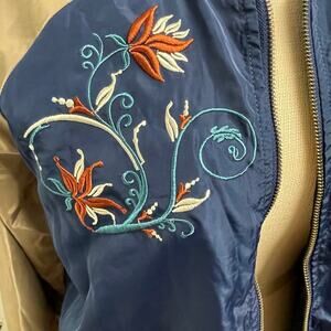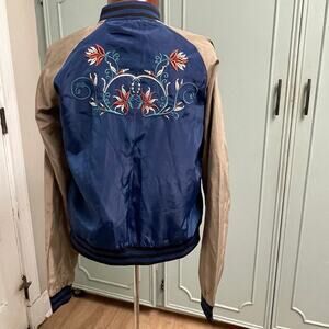 Excellent condition womens size Medium Romeo + Juliet Couture embroidered full zip jacket, features front floral embroidered design as well as large embroidered design on the back