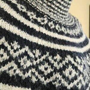 This is a black and white fair isle style sweater by Romeo & Juliet Couture. It has a turtleneck and long sleeves.