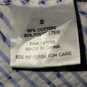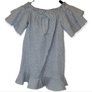 Romeo & Juliet Couture Mini Dress or Tunic Size Small color blue and white striped elastic detail on shoulders, on or off the shoulders, ruffled short sleeve, ruffle bottom, 50% cotton 50% polyester excellent preowned condition (New1588)😊