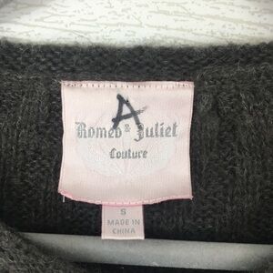 Gray twisted cable knit cardigan with peplum shaping at waist. Double breasted at front and dome closures. Long sleeved.