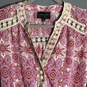 This romper showcases a visually striking combination of pink and white paisley print. It has roll tab sleeves and adding to the boho flair is the crochet detailing.