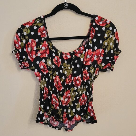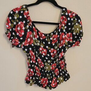 Romeo + Juliet Couture Polka Dot Poppy Floral Milkmaid Top Black White Red Sz M