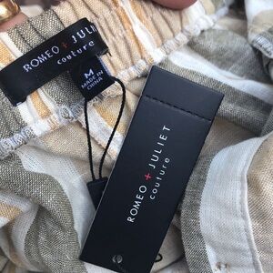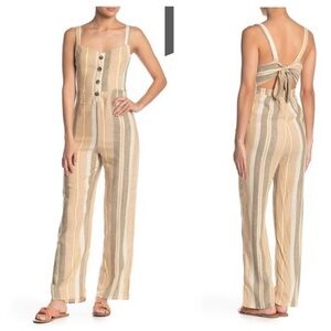Brand new with tags attached Romeo & Juliet Couture “Button Detail Linen Blend Jumpsuit” in Olive Combo RJ54802. Featuring: Sweetheart neck; Adjustable button shoulder straps; Back tie with cutout detail; Front button detail; Striped print; Elasticized waist; Linen blend construction; Approx. 57" length, 30" inseam; 55% linen, 45% rayon
