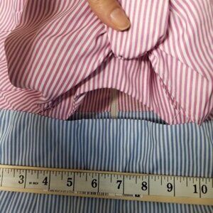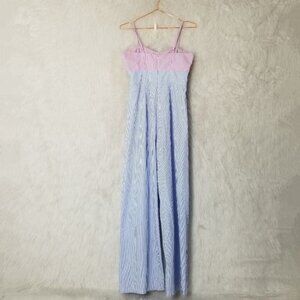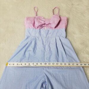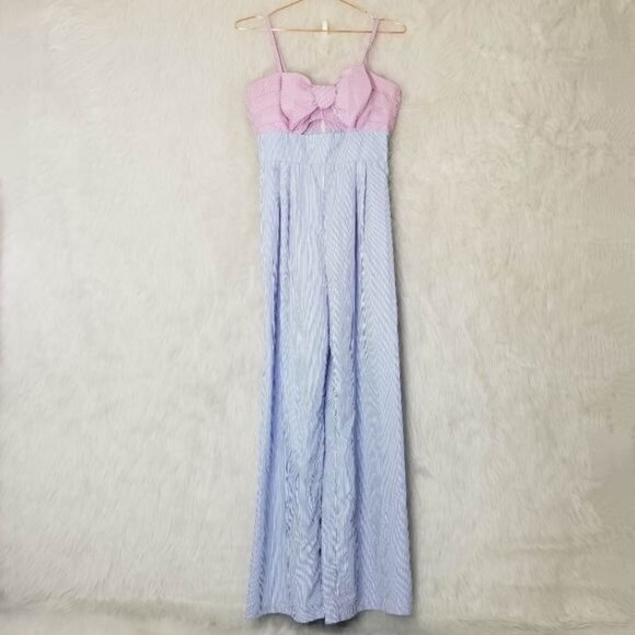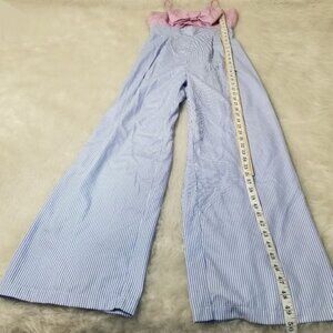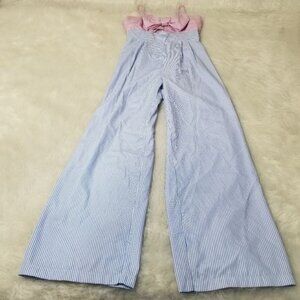 Women's Size Small Pink/White pinstripe with Blue/white color blocking Bow-detail on bust Adjustable spaghetti straps Keyhole cut out Pleated pants Sweetheart neckline Back zip, hook & eye High Waisted Wide Leg Full Length, falls below ankle depending upon height 100% Polyester This item is in excellent pre-loved condition. Measurements in pictures. Please no trades. I cannot model but I am open to reasonable offers. Tags: Knot, Striped, Flirty, Stripes