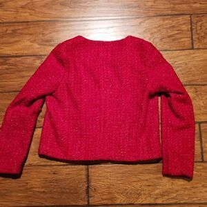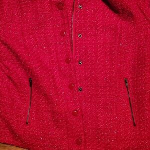 Excellent used condition women's size medium blazer jacket. Full zip front with snap closures. 2 zippered front pockets. Red tweed material with red metallic thread woven in. Pit to pit measures about 18". Sleeve length is about 22". Shoulder to bottom hem is about 20".