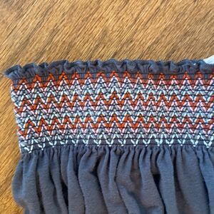 Excellent used condition Romeo & Juliet couture halter jumper, T-shirt, material, at the chest and waist there is a stretch band with reds and grays and pinks and whites, there is a small place at the bottom leg, where someone sewed up a spot see picture, you cannot even tell it’s there. (913.)