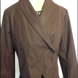 Rich brown color, worn maybe four times total. Shawl collar neckline drops into a single, bound button closure can be worn open too. Front has pointed hem that hangs lower than the back. Fully lined.