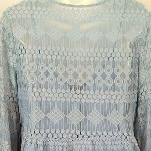 Roman and Juliet size medium new with tags. blue baby doll mini dress sheer lace detail shell with full lining underneath wide sleeves boho to cottage core feel.