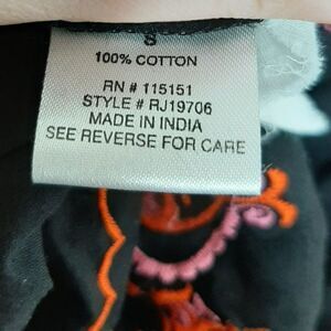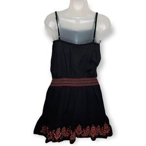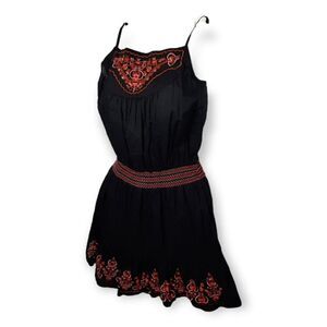 Bright pink, orange, and red bohemian embroidery on a perfect little black dress.