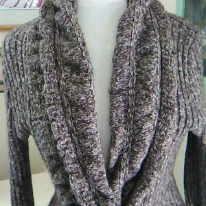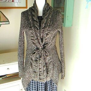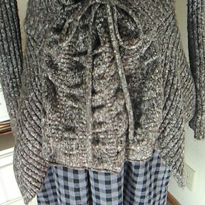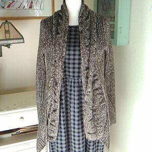 Oversized cardigan in creams and browns. A mixture of knit patterns create the bottom, sleeves and front. Ribbed panels come to a V in front. Attached tie closed, or leave open. Size M measures 44 at chest, 40 at waist, 42 at hips, measured unstretched, but there is stretch in this knit. 30 long from shoulder to hem, 38 to end of points. Perfect for FALL and Winter to make you feel cozy.