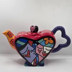 Romero Britto designed mini heart-shaped teapot featuring a pop-art abstract design of a couple kissing. Made in 2010, designed by Romero Britto and produced by Giftcraft. Microwave and dishasher safe. In excellent, beautiful condition. No cracks, chips, or scratches seen.
