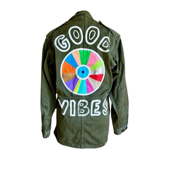 Stylish green military style jacket with button closure and multiple pockets. This Romi Basha jacket features a military cargo style with drawstrings, front flap pockets, long sleeves that are cinched at the wrist, painted "good vibes" on back , Army, casual, bohemian, trendy, artisan, rare.