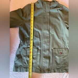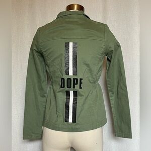 Army green. Has zipper and snap closure at front. Elastic at waist on sides. Lined. Front snap-close pockets. There is a spot on hem of sleeve (smaller than a dime please see photo). Great for chilly summer nights, layered for fall and winter. Truly “dope”. No size tag but mannequin is size 4 so I am listing as medium. Please see measurements on photos