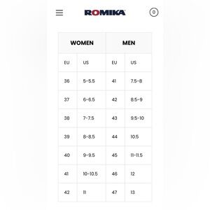 ROMIKA shoes are sized according to the European size standard. To help determine the proper fit, see the chart for reference in the pictures.