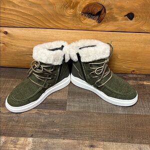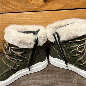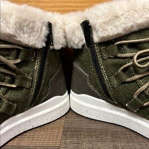 Warm green boots featuring a plush fur trim and lace-up design. Ideal for winter wear.