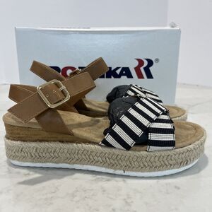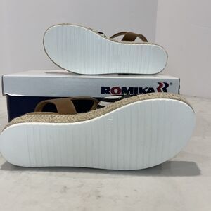 New in Box Romika by Josef Seibel / Westland Madison 01 Black Cream Striped Textile with brown vegan leather ankle strap Platform Wedge Espadrille Sandals Women's Size EU 37 (fits US 6 - 6.5)