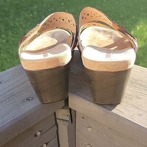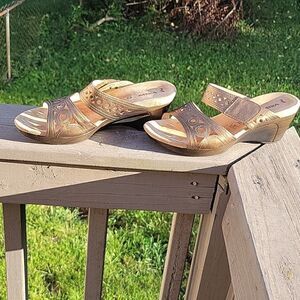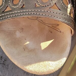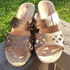 Gently used Romika sandals. Overall still in great condition. The material is a copper color with a circle design. The top strap has adjustable closure. Light staining on R insole near toes, pictured. Otherwise insoles and bottom soles look good.