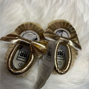 Adorable moccasins for sweet new baby with bow on top and fringe around sides
