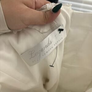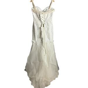 Legends by Romona Keveza Sweetheart Mermaid Wedding Gown in White. Size 10. Features sweetheart neckline, sleeveless, lace-up back closure, lace overlay, mermaid silhouette, sweeping train, and maxi length. 100% Silk. Excellent condition, no flaws.