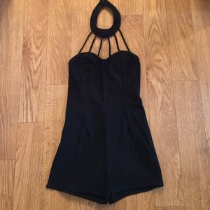 Black, fitted, "caged" romper. Worn once, basically brand-new condition. Fits right, made with rayon, nylon, and spandex. Material has some give but does not stretch out as you wear it.