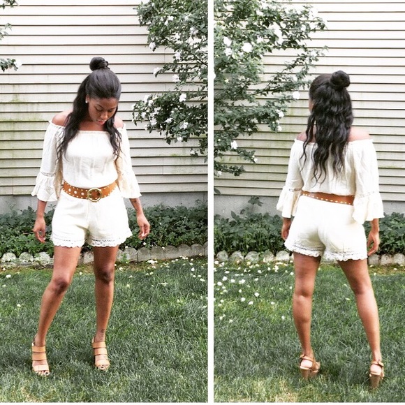 Creme off the shoulder romper. Sizes: Small- X Large. Comment what size you need