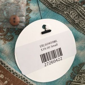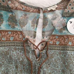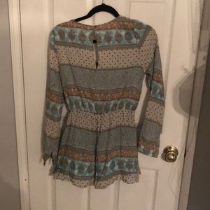 Brand new, Cream, blue, and brown long sleeve romper with ruffles around the bottom. Size small. Bought it and realized when I tried it on at home that it was way too short for me to wear. I am 5’8 but I have a very long torso. The sleeves were good in length and the back has a top button. You can tie the front all the way for more coverage or let it stay more open.