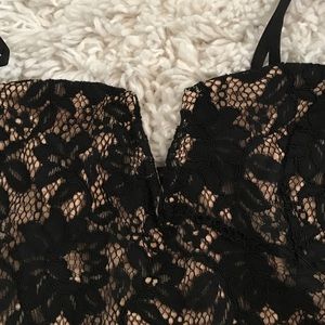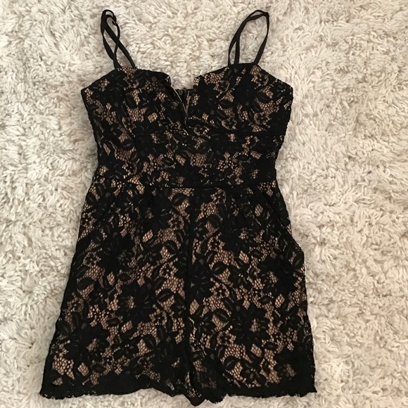 Black lace romper with tan underlay. Has thin straps and a small v cut neck. Fitted fit.