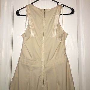 Tan romper with leather like waist line and sleeve caps. Still has the original tag on it! Great for a holiday party!