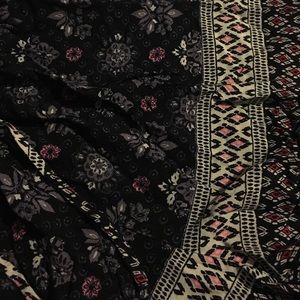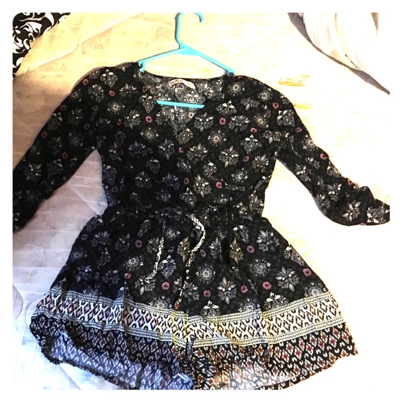 Floral pattern romper black with some pink, red, and tan in it has quarter length sleeves