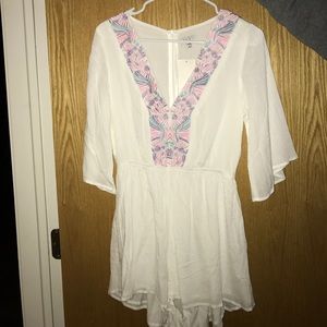 White with pink, purple and mint pattern from Tobi. Never worn. Tag attached