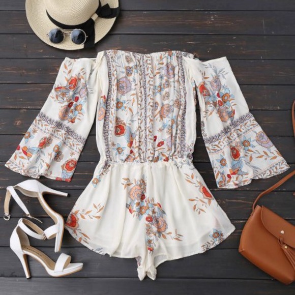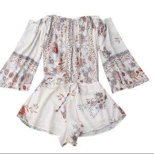 Super cute off the shoulder romper! Flowy and white with a drawstring around the waist