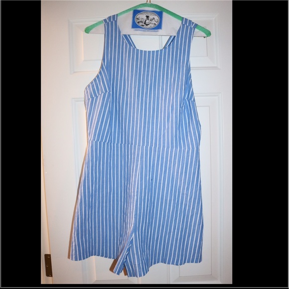 Extremely flattering blue and white striped romper with an open back and criss cross straps!