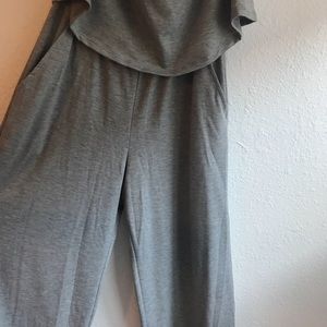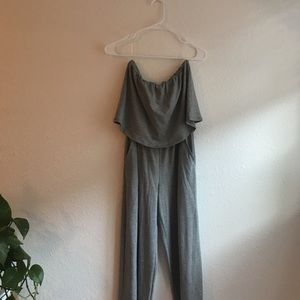 Gray, strapless flowy romper! Elastic holds up the top very well. Could easily fit a M.